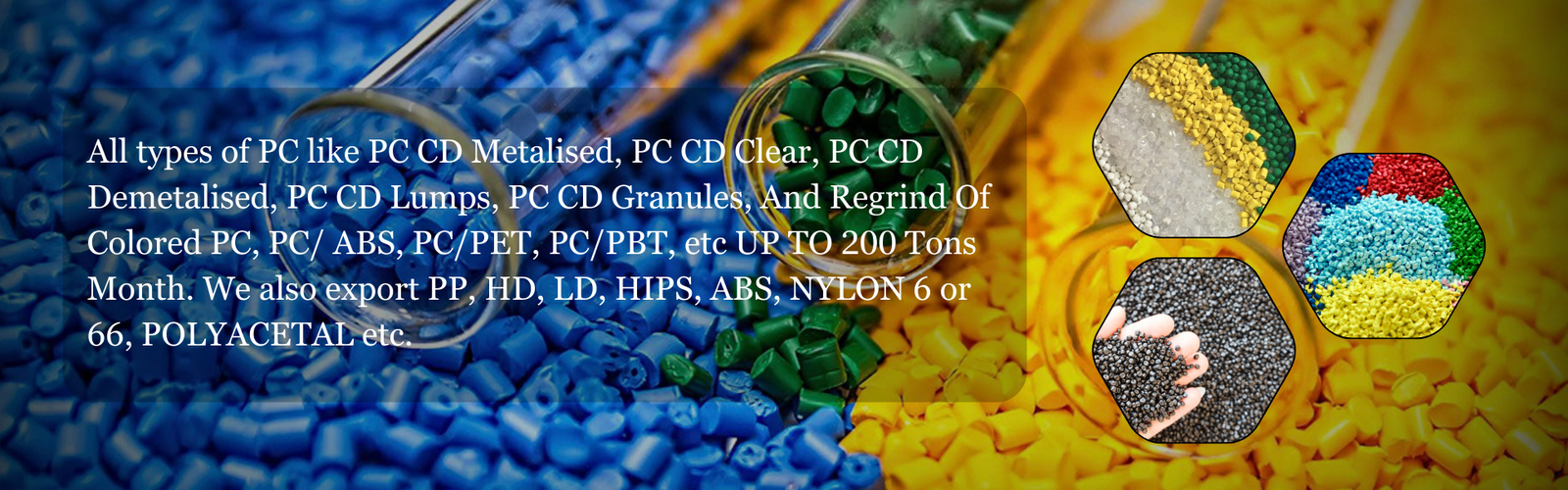 All types of PC like PC CD Metalised, PC CD Clear, PC CD Demetalised, PC CD Lumps, PC CD Granules, And Regrind Of Colored PC , PC/ ABS , PC/PET, PC/PBT etc UP TO 200 Tons Month. We also export PP, HD, LD, HIPS, ABS, NYLON 6 or 66, POLYACETAL etc. We are specialized to export all types of PP granules in various colors made from raffia or injection. We always send all samples free of charge and inspection is always welcome.We are Alibaba Gold Member from last 7 years. We endeavor to provide you with the highest quality plastic feedstock available in the plastics market. All recycled plastic materials that we sell must pass a rigorous quality and conformation test prior to Loading